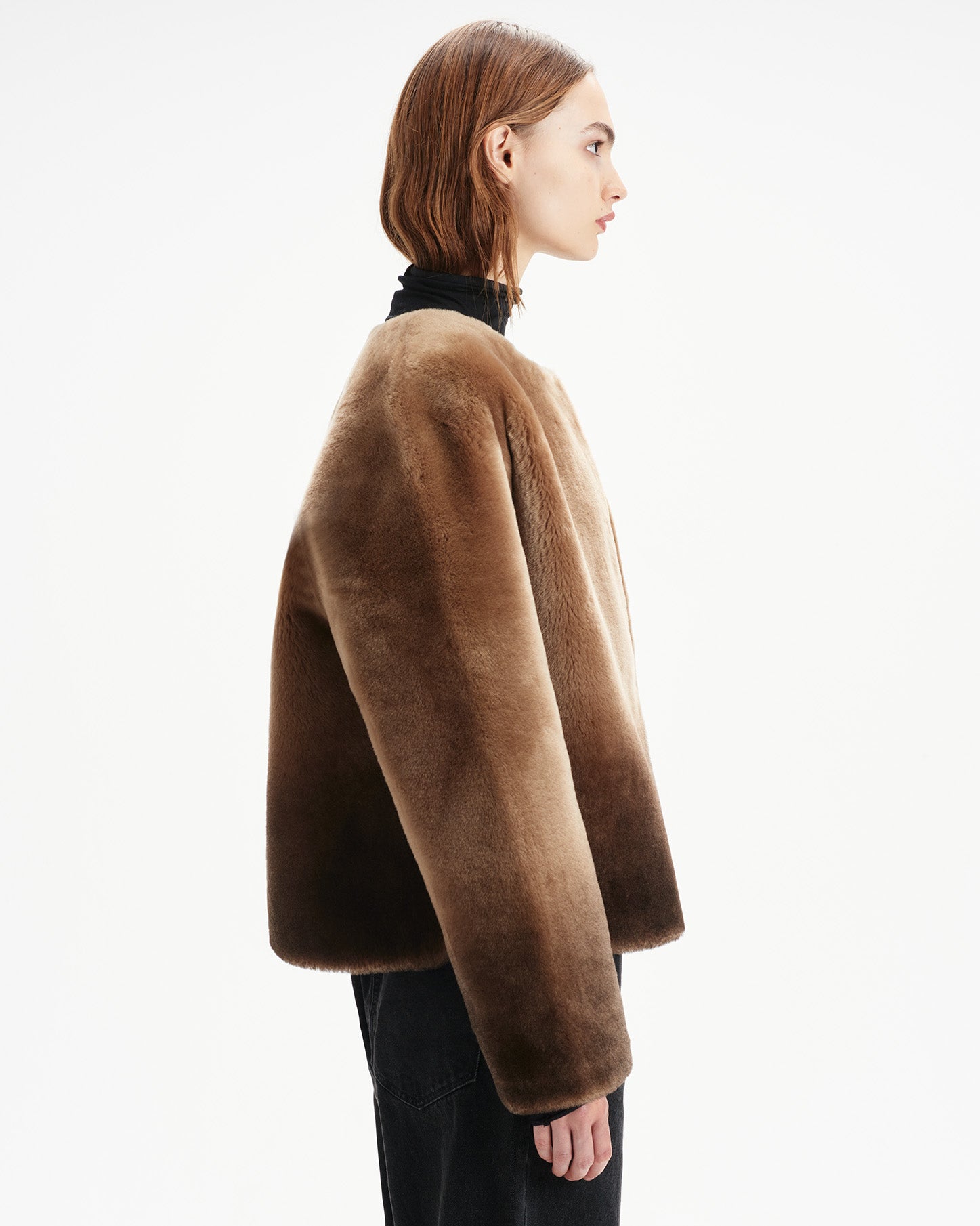 Uniquely chic, this ombre-effect shearling has been exclusively developed for SSC on an unlined double-faced straight hair with a nappa finish reverse on the inside.