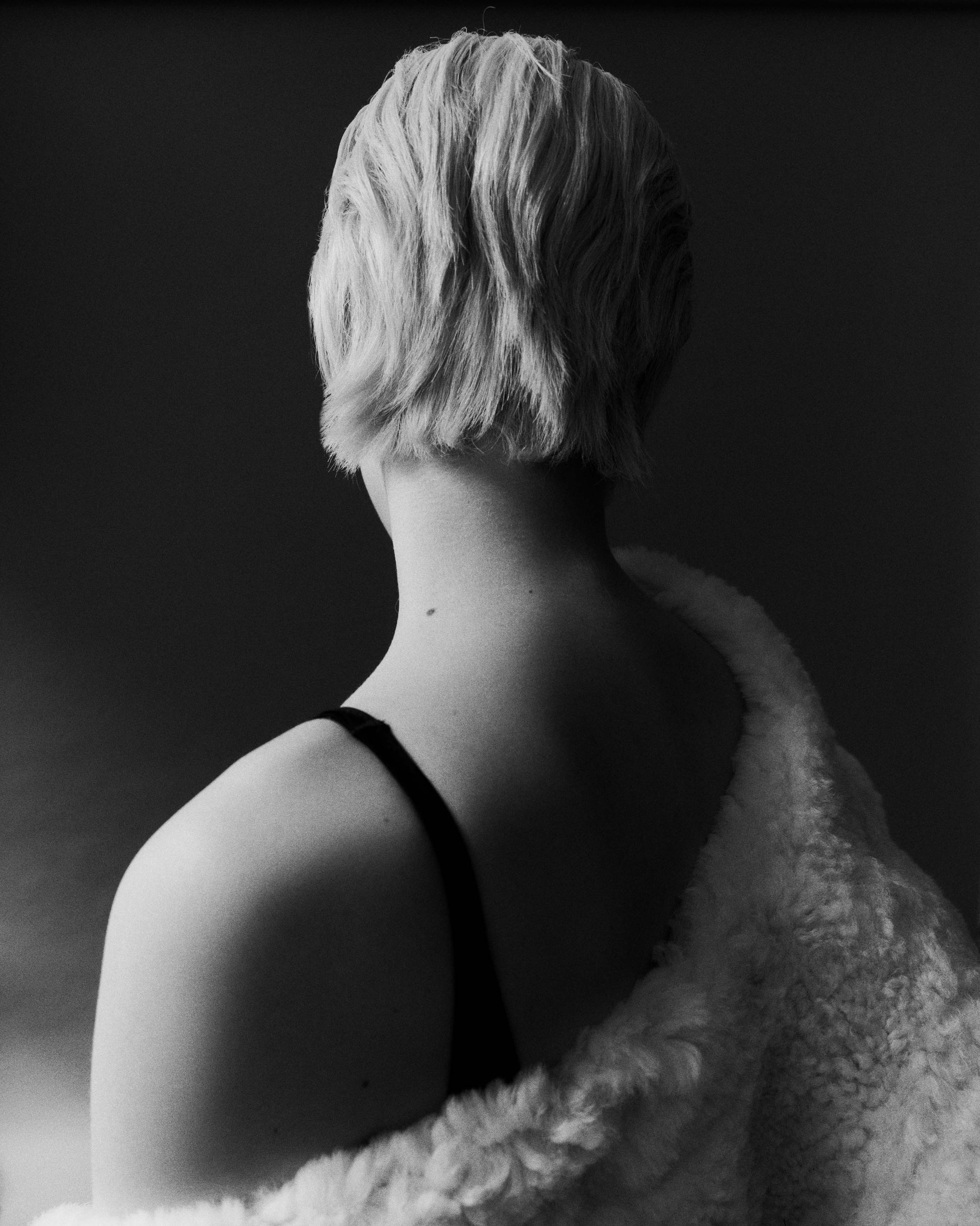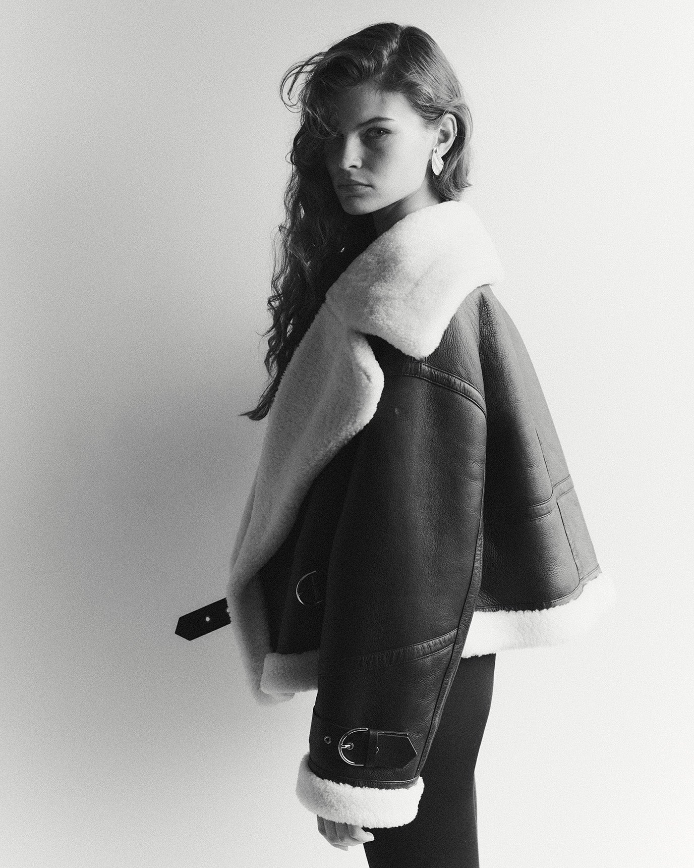 - Black nappa with exaggerated natural white shearling collar, lapel and trim